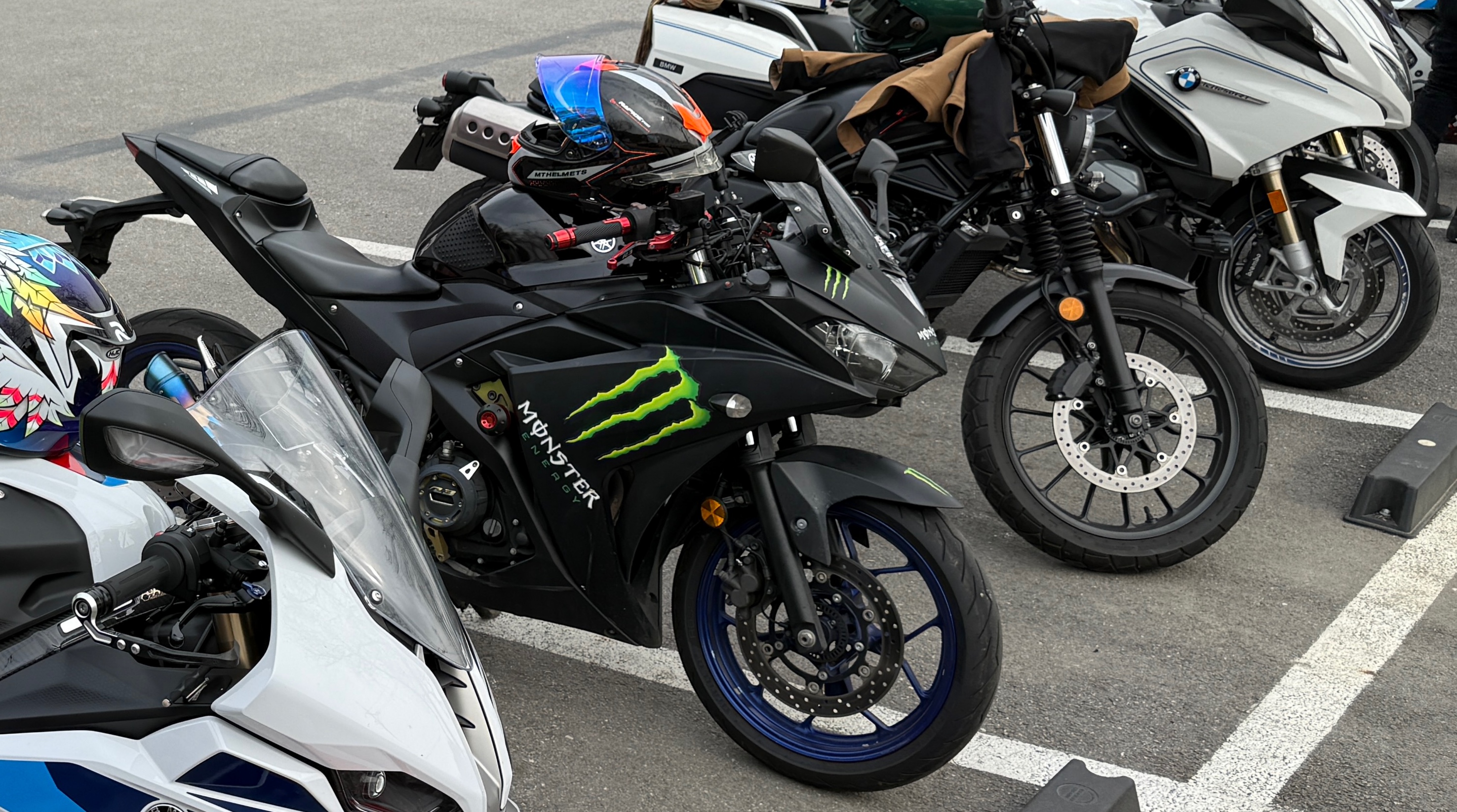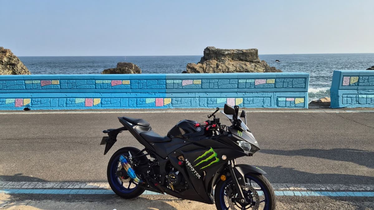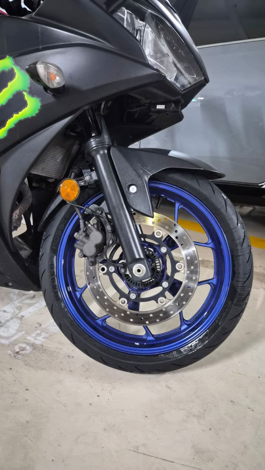 몬스터 에너지 데칼이 붙어있고 휠 색상은 블루입니다